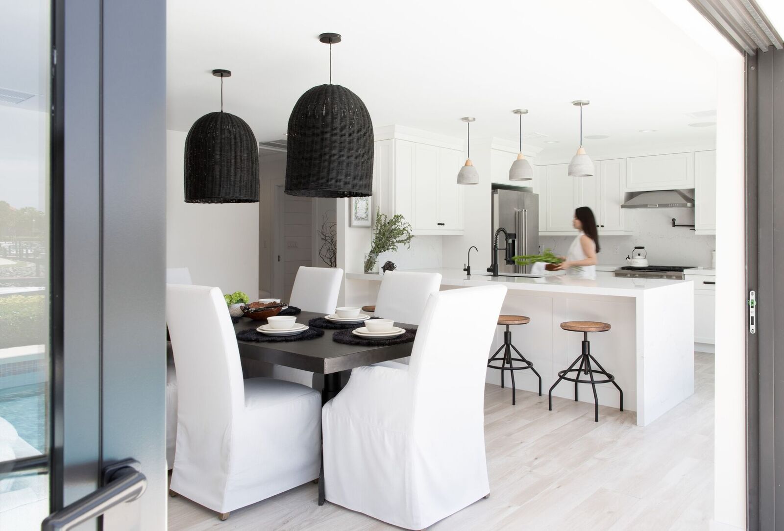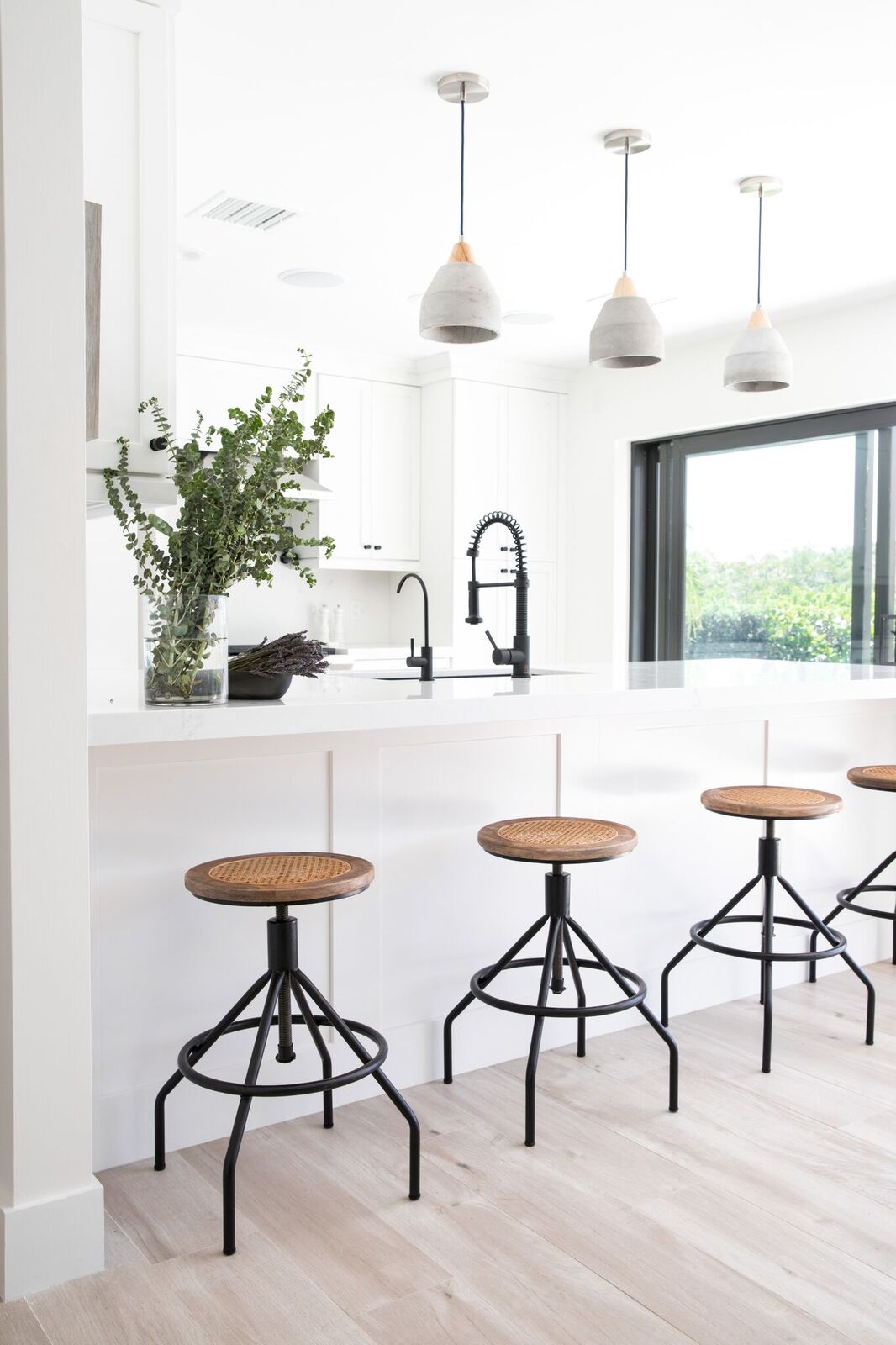 The kitchen, bar, and pantry flow seamlessly, combining influences from New York, Connecticut, and Florida. The bar to the left nods to East Coast sophistication with darker cabinetry and leather hardware, while the kitchen embraces bright, airy Florida living. Together, they create a space that is both functional and visually stunning, perfect for family life and entertaining.